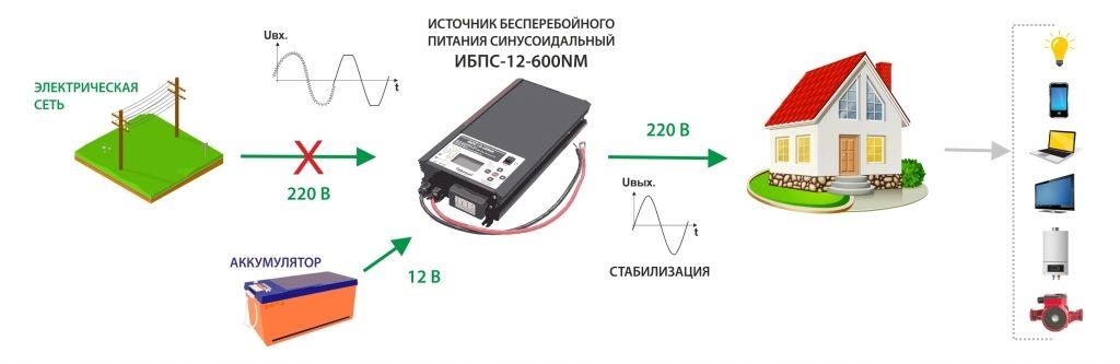 Двойное преобразование позволяет достичь полной независимости качества выходного тока от состояния сети. Не важно, есть и скачки напряжения, качество выходного тока будет стабильным при любых перебоях. Инвертирование с помощью такого бесперебойника осуществляется без перерыва, так как батарея ИБП всегда включена в сеть, что дает возможность моментально сглаживать любые скачки и перебои.